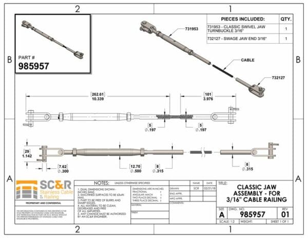- Note: For all Assembly lengths >50′ (70′ max) and/or runs from 0-70′ with more than 1 90 degree corner, it is recommended to omit the SWAGE JAW END and use 2 CLASSIC JAW TURNBUCKLES instead to allow cable tightening at both ends of your run.
