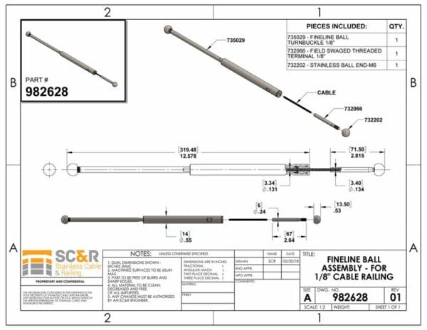 - Note: For all Assembly lengths >50′ (70′ max) and/or runs from 0-70′ with more than 1 90 degree corner, it is recommended to omit the SWAGE BALL END and use 2 FineLine™ BALL TURNBUCKLES instead to allow cable tightening at both ends of your run.