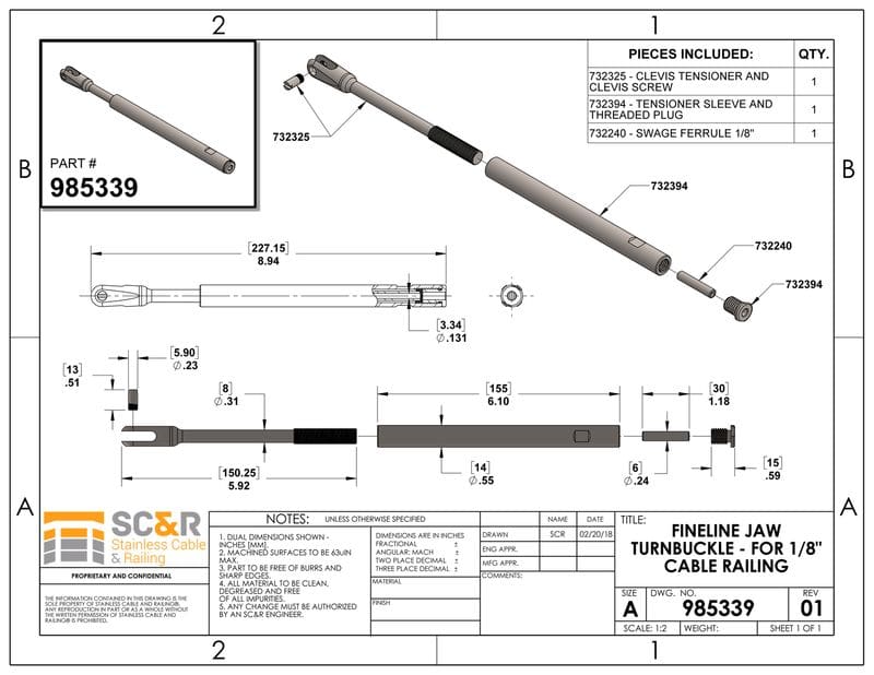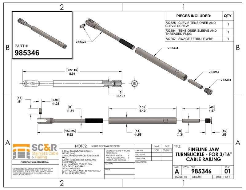See number “2” in the above drawings to see how the FineLine™ JAW TURNBUCKLE is used in the wire rope cable assembly.