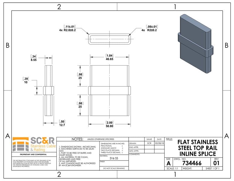 Flat Stainless Steel Inline Splice for Top Rail