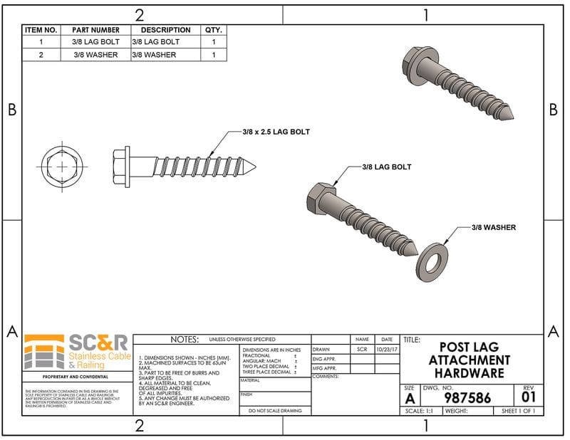 These lag bolts are used for deck mounting posts into wood. Available in three lengths to accommodate your application. Made out of 304 Grade Stainless Steel.