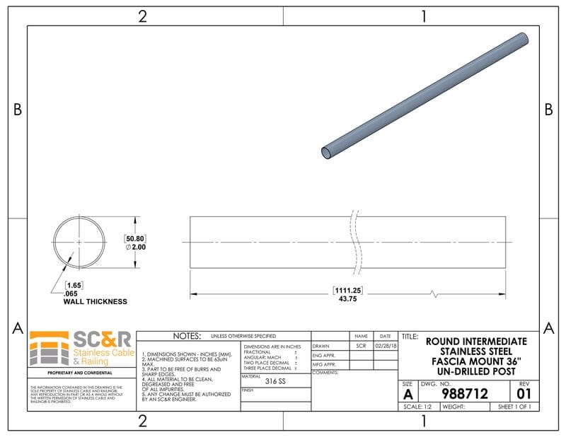 - Dimensions: 2in OD with 1.6mm wall thickness. For Cable Railing Systems at 36in Rail Height