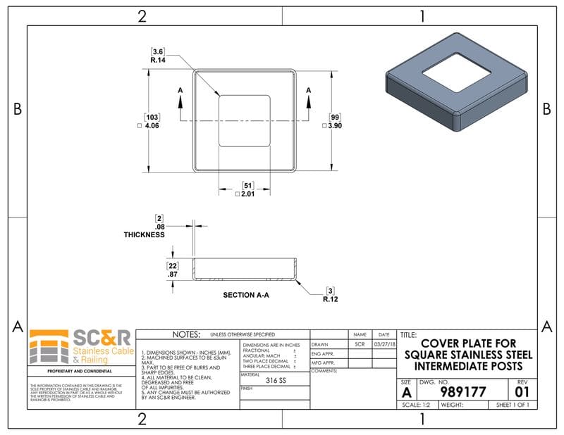 Cover Plate for Square Stainless Steel Intermediate Posts
