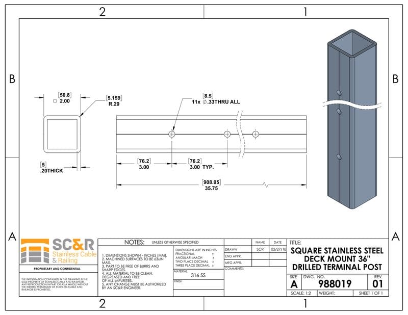 Square Stainless Steel Deck Mount 36″ Drilled Terminal Post