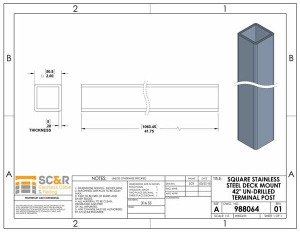 Square Stainless Steel Deck Mount 42″ Un-Drilled Terminal Post