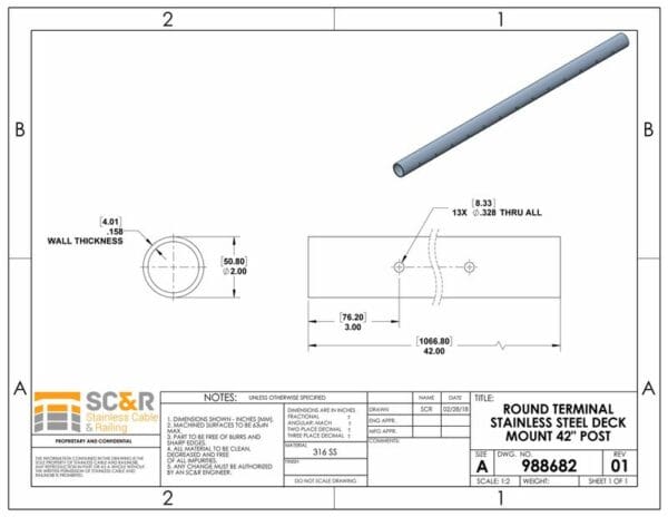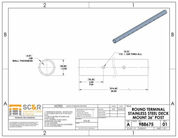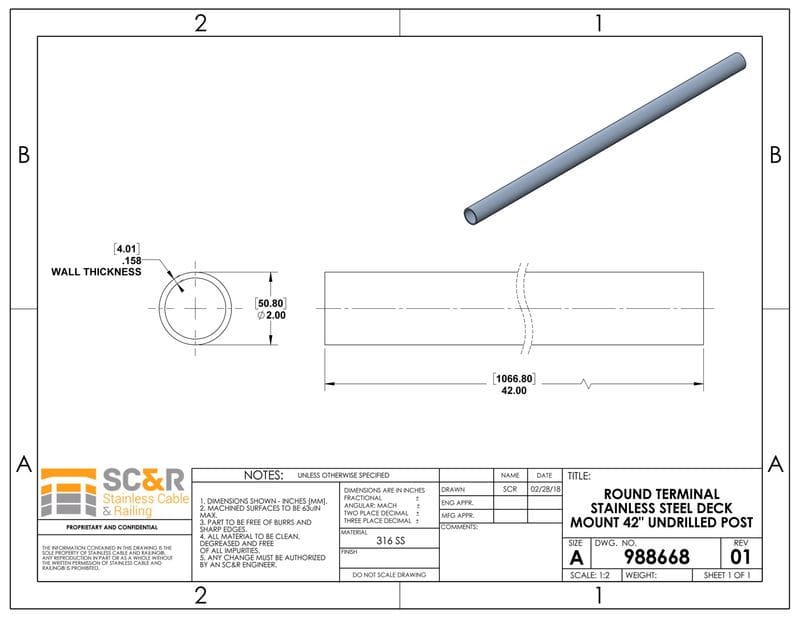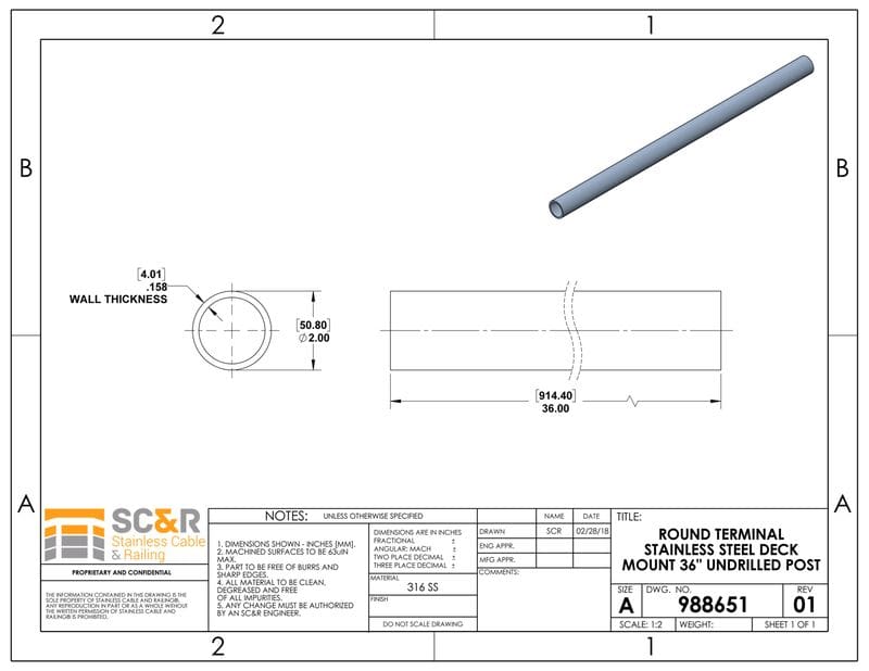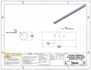 • 2in OD Brushed Finish 316 Marine Grade Stainless Steel Post w/ 0.158″ wall thickness