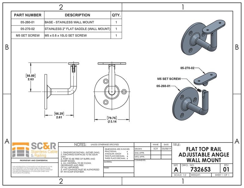 Adjustable Angle Flat Top Rail Wall Mount for Flat Wood or Metal Handrail on angled or level surfaces.