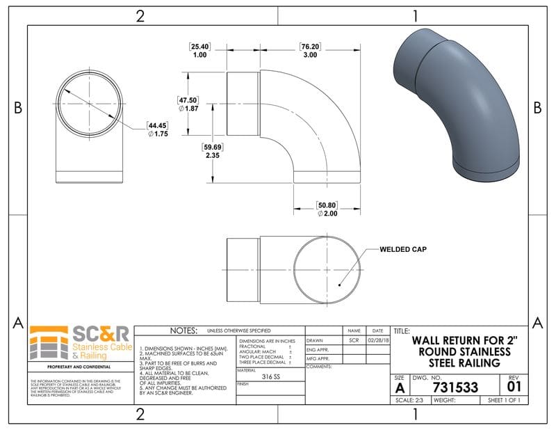 WALL RETURN FOR 2″ ROUND STAINLESS STEEL RAILING SYSTEM